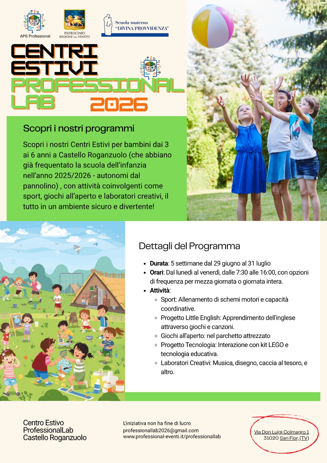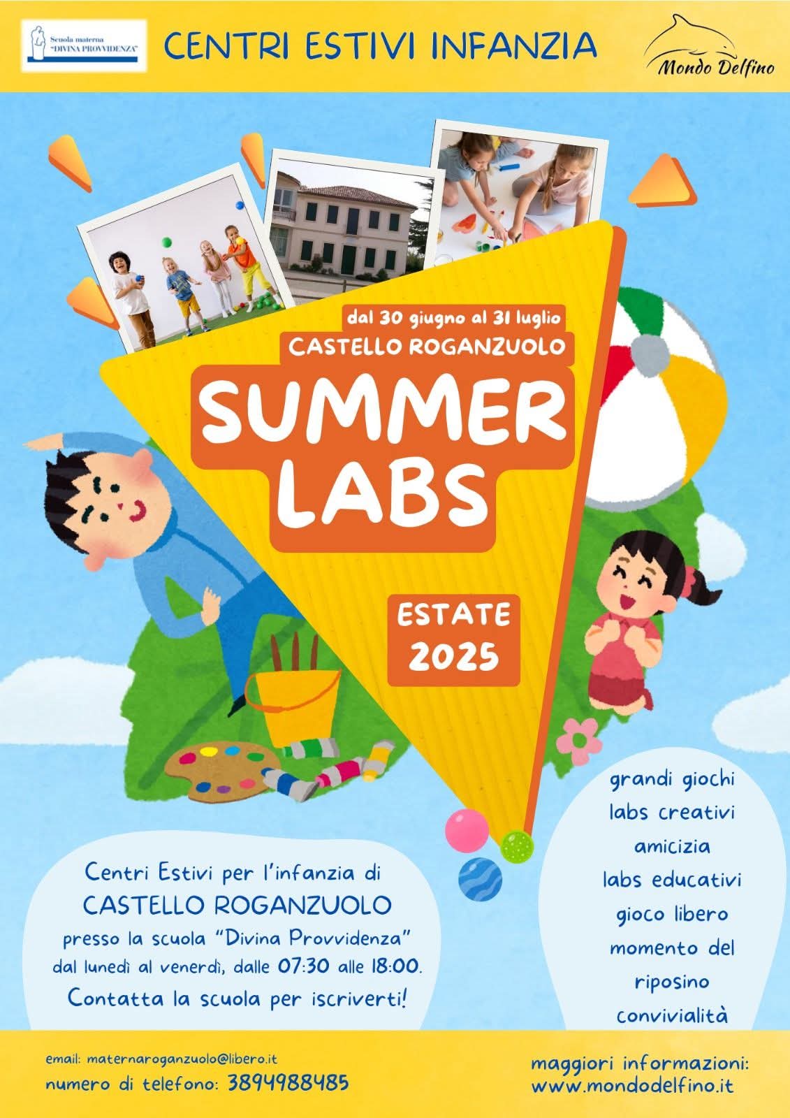 Dal 30 giugno al 31 luglio, presso il Centro d'Infanzia Divina Provvidenza, verrà organizzato il consueto Centro Estivo per l'Infanzia. Grandi giochi, labs creativi, amicizia, labs educativi, gioco libero, momento del riposino, convivialità. Per informazioni ed iscrizioni, i contatti sono i soliti: